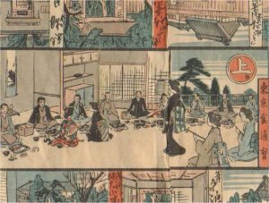 船宿風料亭に江戸の情緒あり。表玄関が隅田川に面していた店も多い。震災前の日本橋魚河岸の様子も。八百善、星ケ岡茶寮、魚久(料亭)、竹葉亭、大和田、宮川(鰻屋)、薮蕎麦等今も続く名店もある大正グルメ双六。キラ刷り。 |